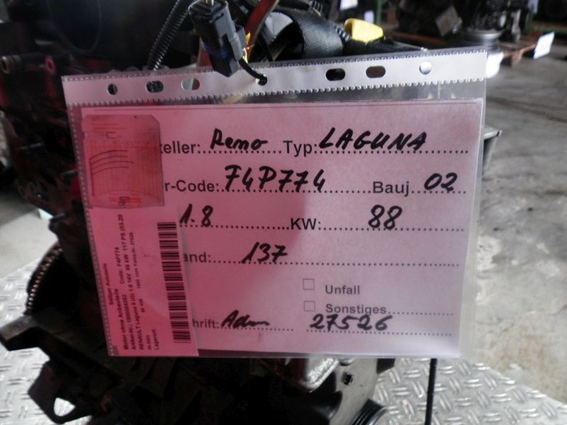 Motor ohne Anbauteile (Benzin) RENAULT Laguna II (G) 1.8 16V 86 kW 117 PS (03