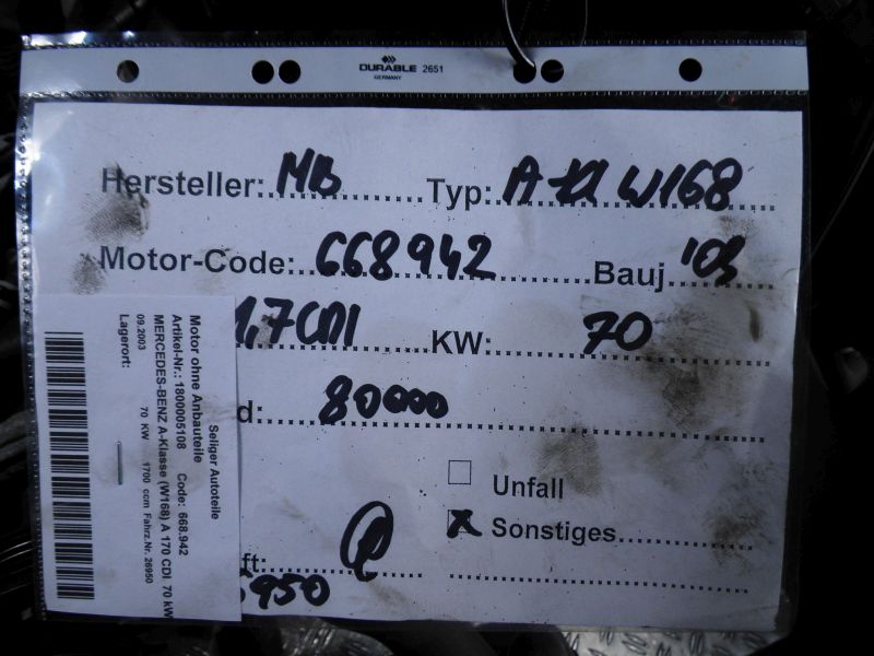 Motor ohne Anbauteile (Diesel) MERCEDES BENZ A-class (W168) A 170 CDI (168.009, 168.1